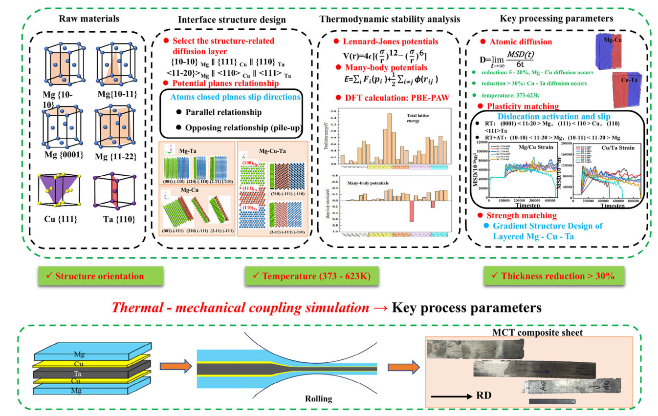 基于界面工程理论,研究者提出了一种新的基于晶格匹配的异质界面结合的调控方法,首先通过第一性原理(DFT)计算,精准调控不同晶格的结合方式,通过错配度和结合功的双重优化,设计出了最佳的镁/铜/钽的晶格排列方式(图1)。随后,利用分子动力学(MD)模拟,分析优化了多个工艺参数,确定了最佳的工艺参数及其范围,然后,利用热轧变形的工艺实现了轻质镁和难熔钽的强界面结合,该界面区域由3种异质晶格点阵(hcp/fcc/bcc)构成,并形成了锯齿宽度从十数微米、具有原子互扩散的2种跨尺度机械互锁异质界面。