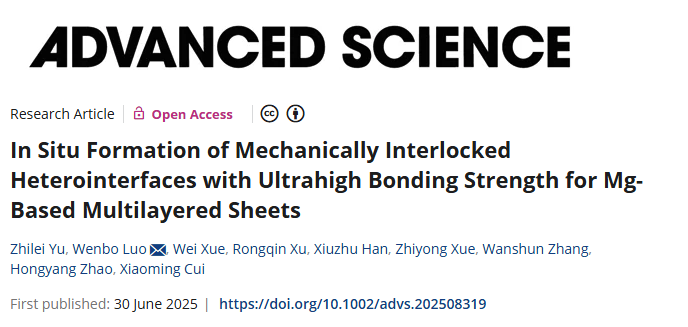近日,先进材料研究院薛志勇教授团队在异质界面层状材料设计和调控研究中取得重要突破,相关研究“In Situ Formation of Mechanically Interlocked Heterointerfaces with Ultrahigh Bonding Strength for Mg-Based Multilayered Sheets”于2025年6月30日在线发表在国际顶尖期刊《Advanced Science》上。304永利集团博士研究生于智磊为第一作者,罗文博老师为通讯作者。
