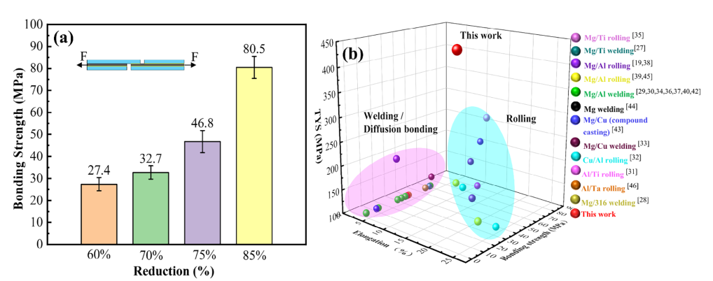 航空航天、新能源汽车、人形机器人等领域,轻质的镁基金属材料具有重要的应用,然而,由于服役条件的复杂性,镁基合金的耐辐射性能、耐腐蚀性能很差。为提升其综合性能,需要为镁“穿上”一层重金属,然而,轻质的镁和重金属(比如Ta、W等)无法互容,传统方法难以实现强结合界面。研究者通过多层异质晶格调控的新方式,即在Mg/Cu/Ta层状复合材料中实现原位“自组装”的机械互锁强结合界面,界面结合强度达80.5 MPa(较传统方法提升25%以上),同时保持340-395 MPa抗拉强度和5-10.2%的延伸率,综合力学性能在镁基层状复合材料领域表现最好,同时,该材料还兼具优异的耐辐照性能(是传统镁合金的10倍以上)。该成果提供了一种新的材料设计和调控范式。