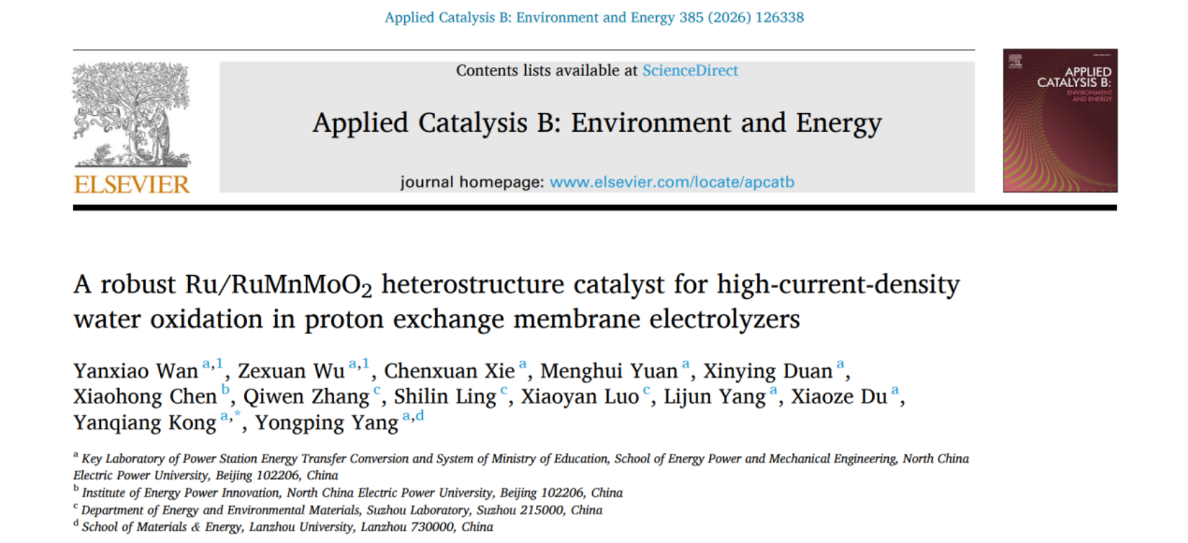 近日,华北电力大学孔艳强副教授在《Applied Catalysis B: Environment and Energy》期刊在线发表了题为“A robust Ru/RuMnMoO2 heterostructure catalyst for high-current-density water oxidation in proton exchange membrane electrolyzers”的研究论文,华北电力大学为论文第一完成单位,304永利集团硕士研究生万延笑、博士研究生吴泽轩为第一作者,孔艳强为通讯作者。该研究工作得到了国家自然科学基金的资助。