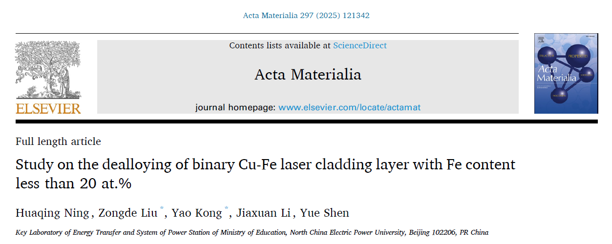 近日,304永利集团刘宗德教授团队在用于海洋生物污损防护的微纳米通道新材料研究中取得重要突破。研究团队于7月12日在国际权威学术期刊《Acta Materialia》上发表了题为“Study on the dealloying of binary Cu-Fe laser cladding layer with Fe content less than 20 at.%”的研究论文,华北电力大学为该成果唯一完成单位。刘宗德教授、孔耀老师为通讯作者,304永利集团博士研究生宁华清为第一作者。