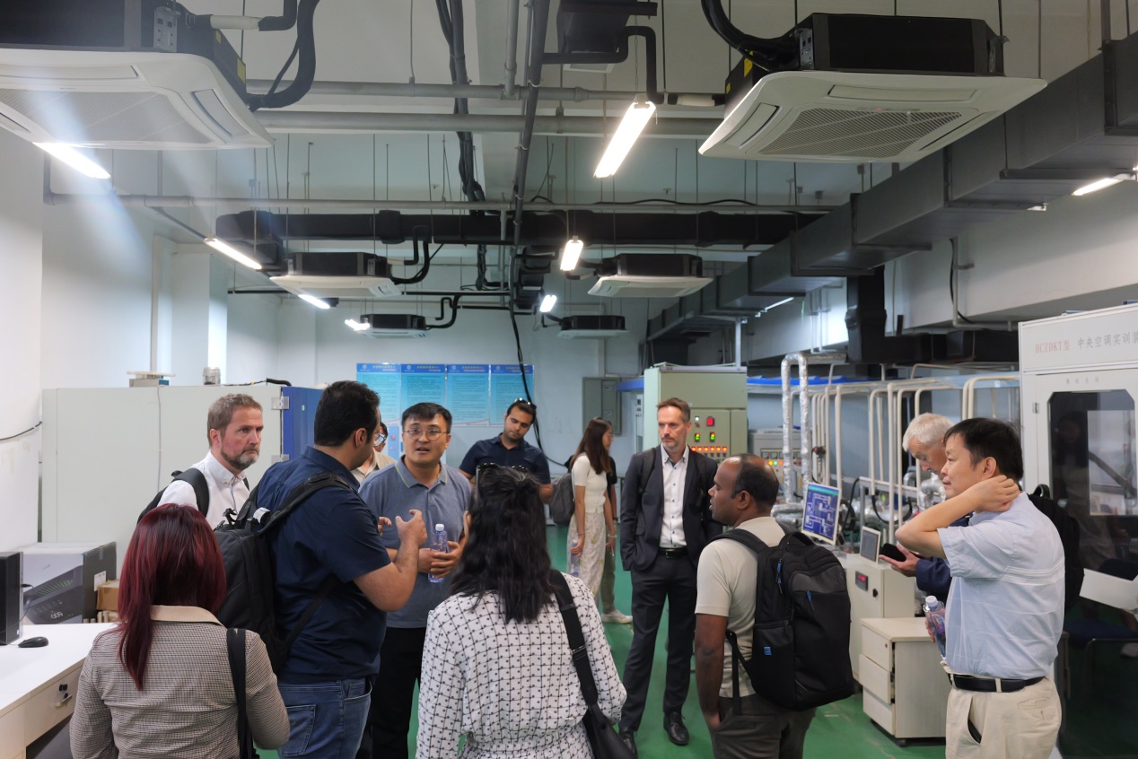 张宇宁对挪方研究团队来访表示欢迎,他介绍了华北电力大学在清洁高效燃煤发电、多能互补系统、零碳建筑技术等领域的研究成果,挪方项目负责人Vojislav Novakovic(沃伊斯拉夫·诺瓦科维奇)教授对华北电力大学的研究成果给予高度评价。张宇宁陪同来访专家参观了国家火力发电工程技术研究中心和电站能量传递转化与系统教育部重点实验室,并与挪方团队就烟塔合一、超低排放等先进燃煤清洁利用技术进行探讨。孙健介绍了零碳能源建筑技术研究所的超高温电动热泵实验测试平台,围绕正在执行的国际合作项目,与挪方研究团队就新型热力学循环及绿色工质开发展开技术交流。来访专家还参观了新能源电力系统全国重点实验室,以及公司员工服务中心综合智慧能源运行管控平台。