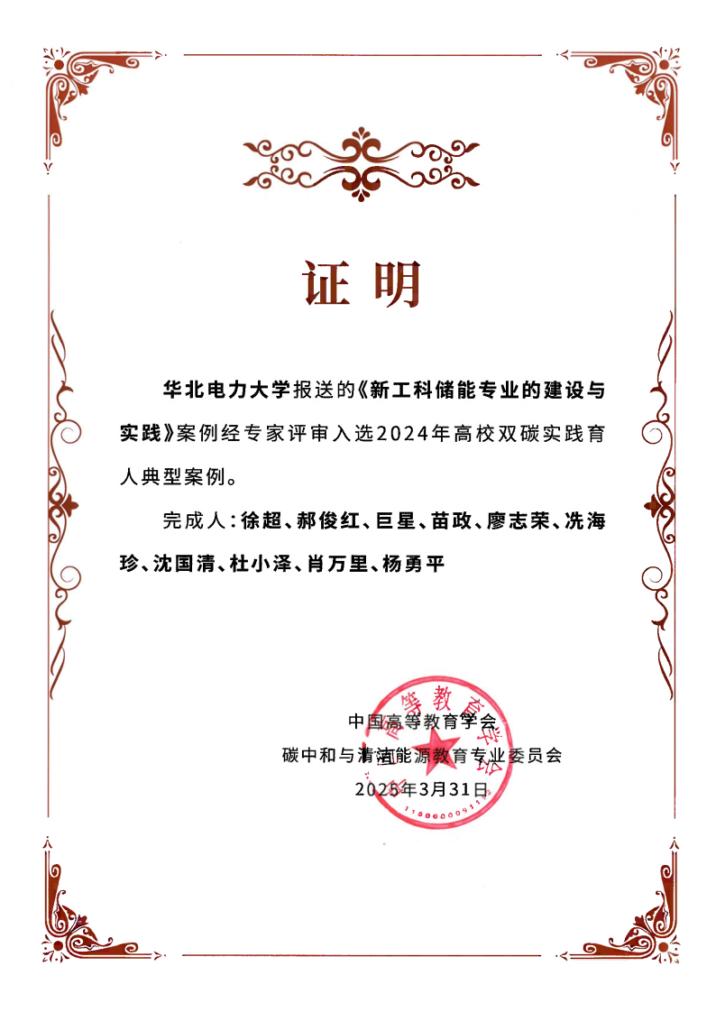 近日,中国高等教育学会碳中和与清洁能源教育专业委员会(全国唯一以碳中和命名的专委会)公布2024年高校双碳实践育人典型案例评选结果,由304永利集团、能源电力创新研究院徐超教授等报送的《新工科储能专业的建设与实践》成功入选。